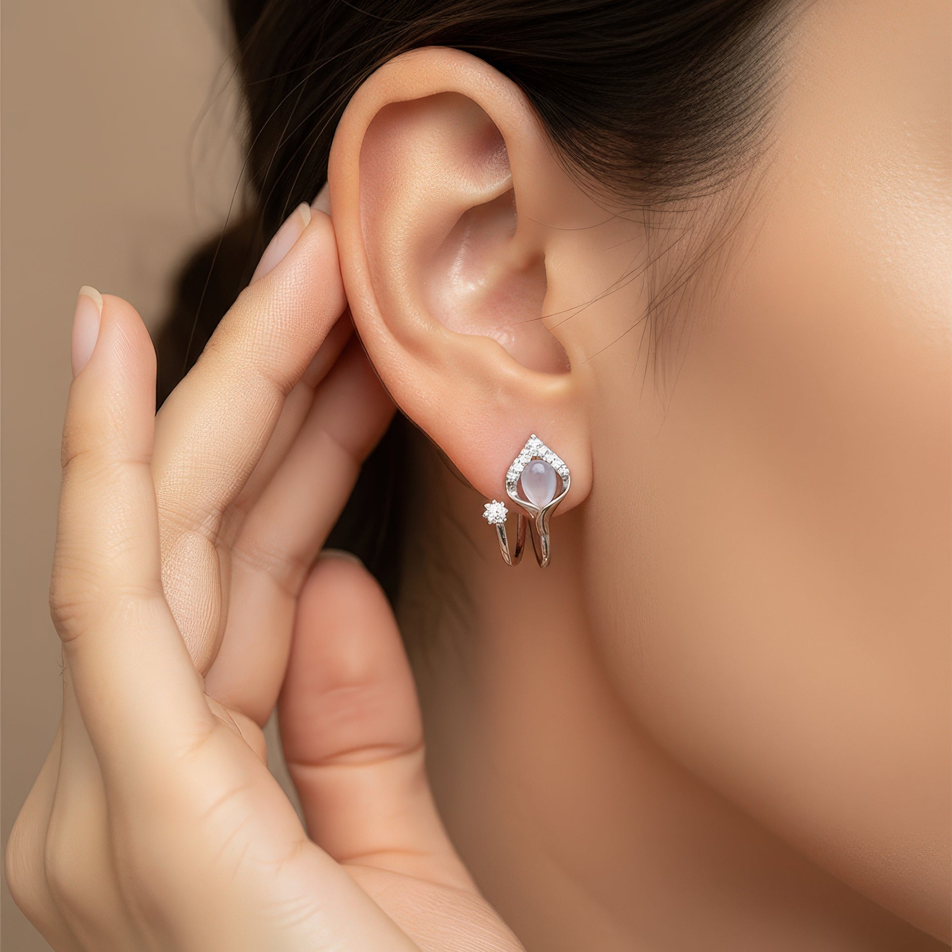 Embrace your look with the delicate, contemporary charm of the Silver Tulip Earrings. These unique earrings perfectly blend feminine grace with minimalist style. Crafted in polished silver-tone metal, the design wraps elegantly around the bottom of the earlobe, resembling a stylized tulip or a blossoming petal. The main feature is a captivating white cat's eye or mother-of-pearl stone, which shimmers with a soft, ethereal glow. The look is completed by a tiny, sparkling cubic zirconia accent that rests near the base, adding a subtle touch of glamour. Perfect for those who love modern jewelry with a floral twist, these cuff studs offer effortless sophistication for day or night.