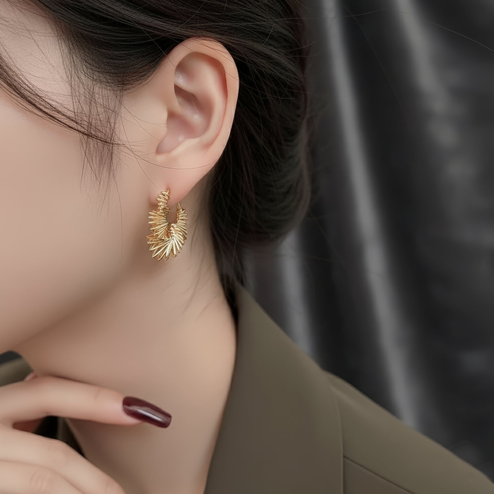 You know the feeling when you find that perfect pair of everyday earrings that are anything but basic? That's the Sunburst Mini Hoops. They're a little dose of artistry for your ear, featuring an intricate, woven texture that makes them look like tiny, folded golden fans. They hug your lobe close, catching the light with their gorgeous dimension—a sophisticated upgrade to your classic hoop, perfect for elevating your jeans and a tee or finishing off your favorite dress.