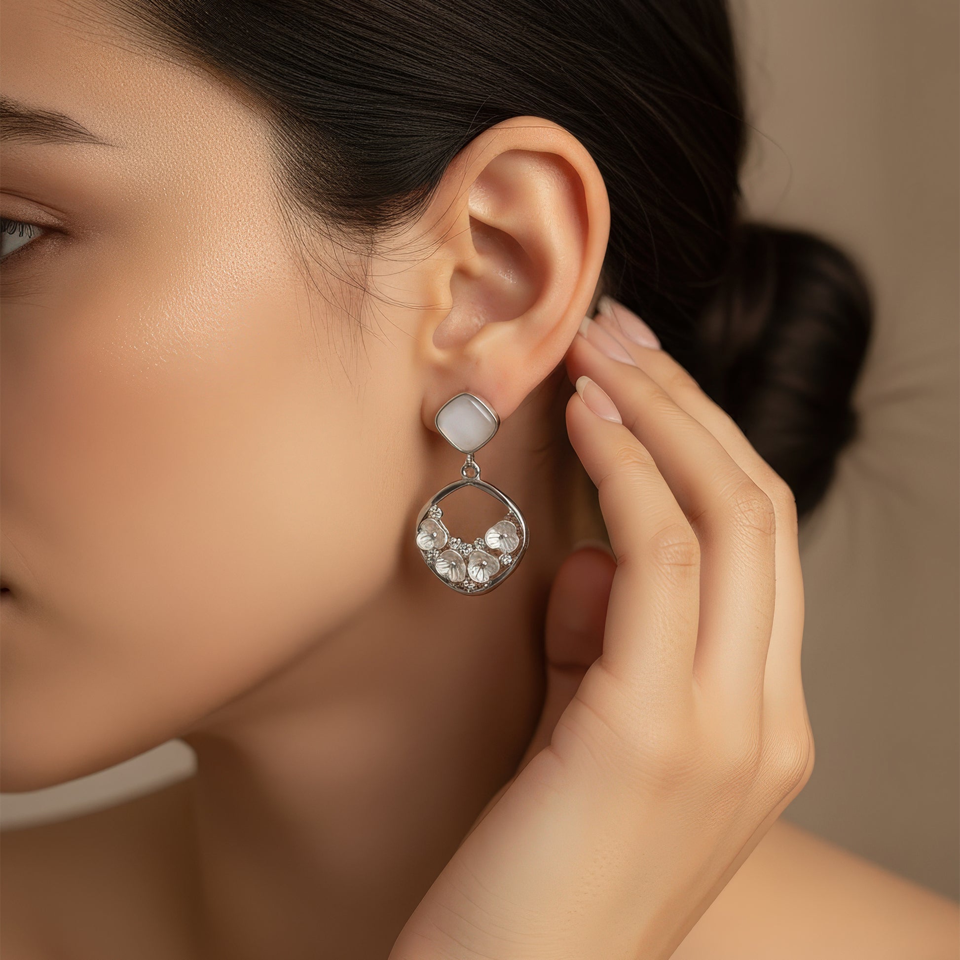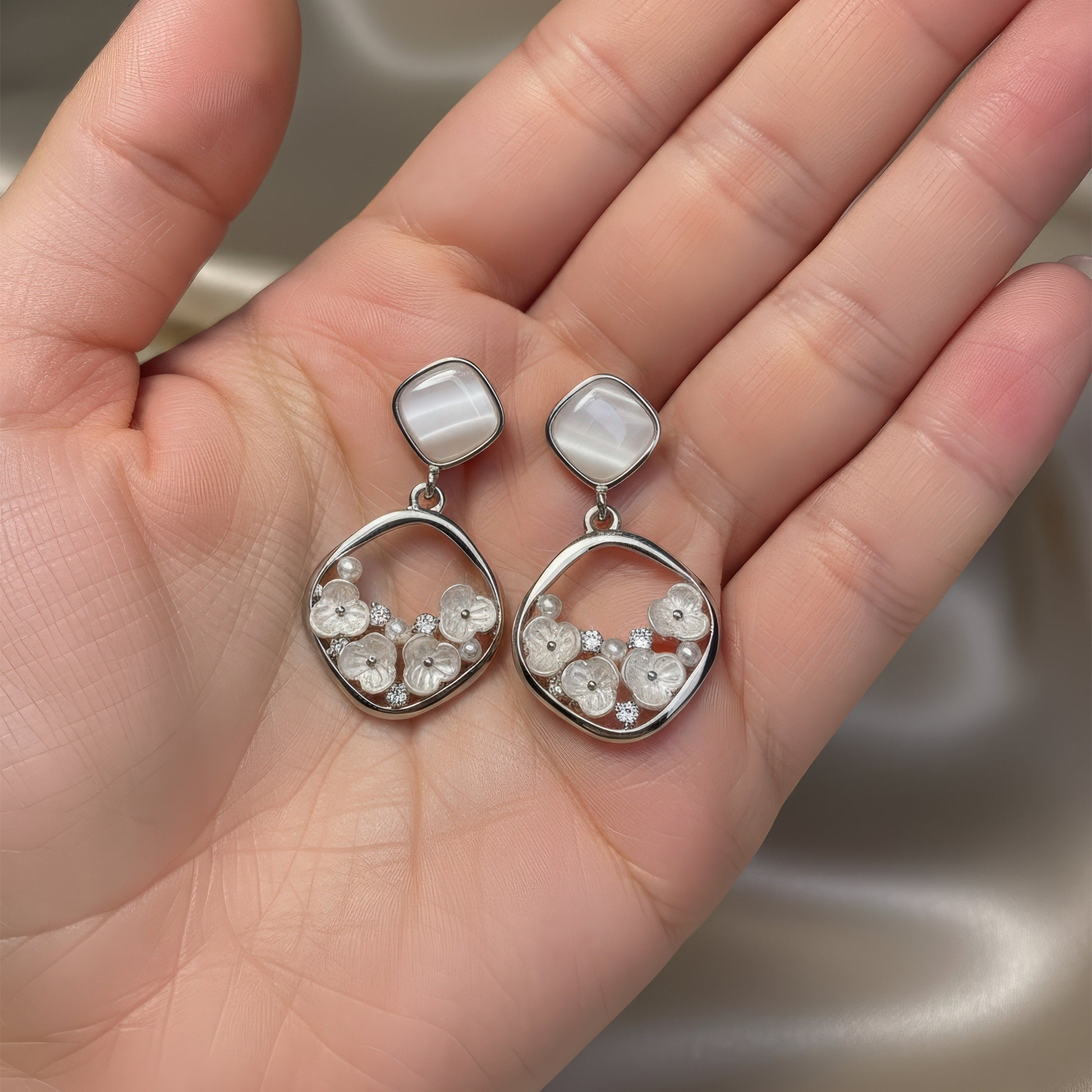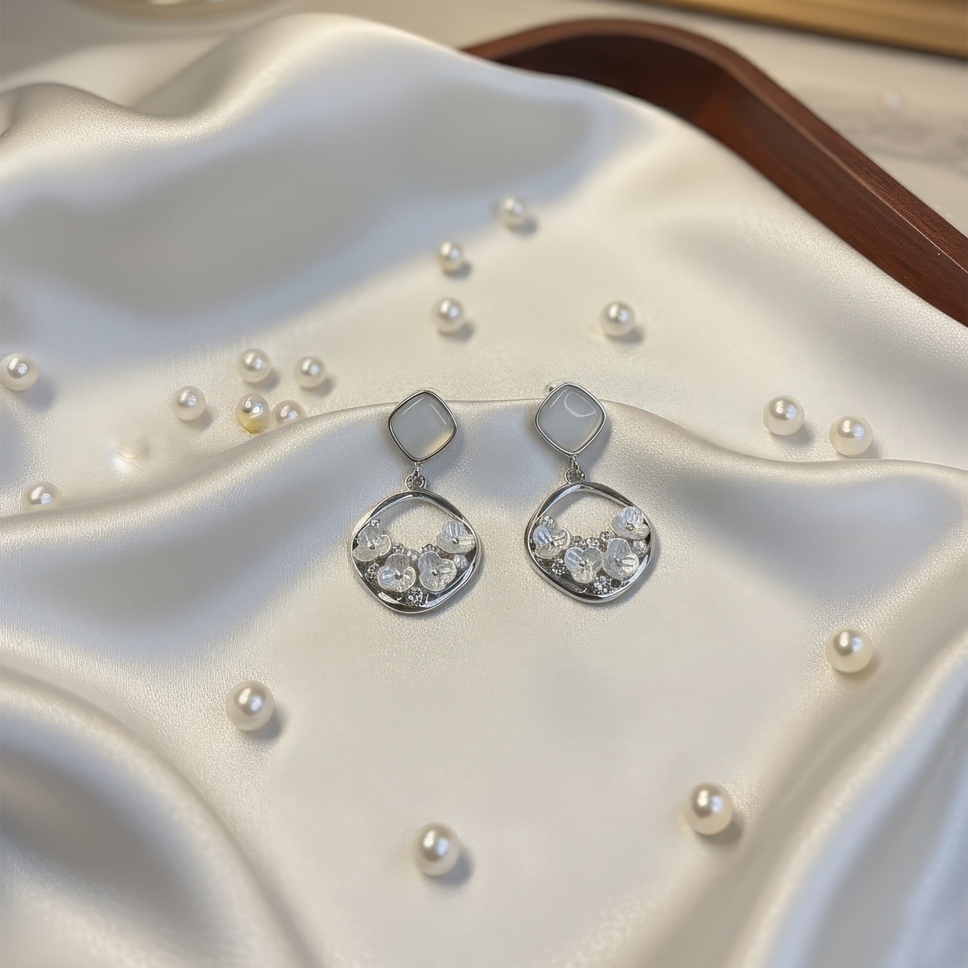 Softly radiant and effortlessly refined, the Pearl Whisper Earrings capture the quiet poetry of elegance. Designed with a luminous square stone and a delicate circular drop adorned with crystal and pearl accents, this pair brings a subtle glow to every occasion. Perfect for those who believe in understated luxury that speaks volumes.