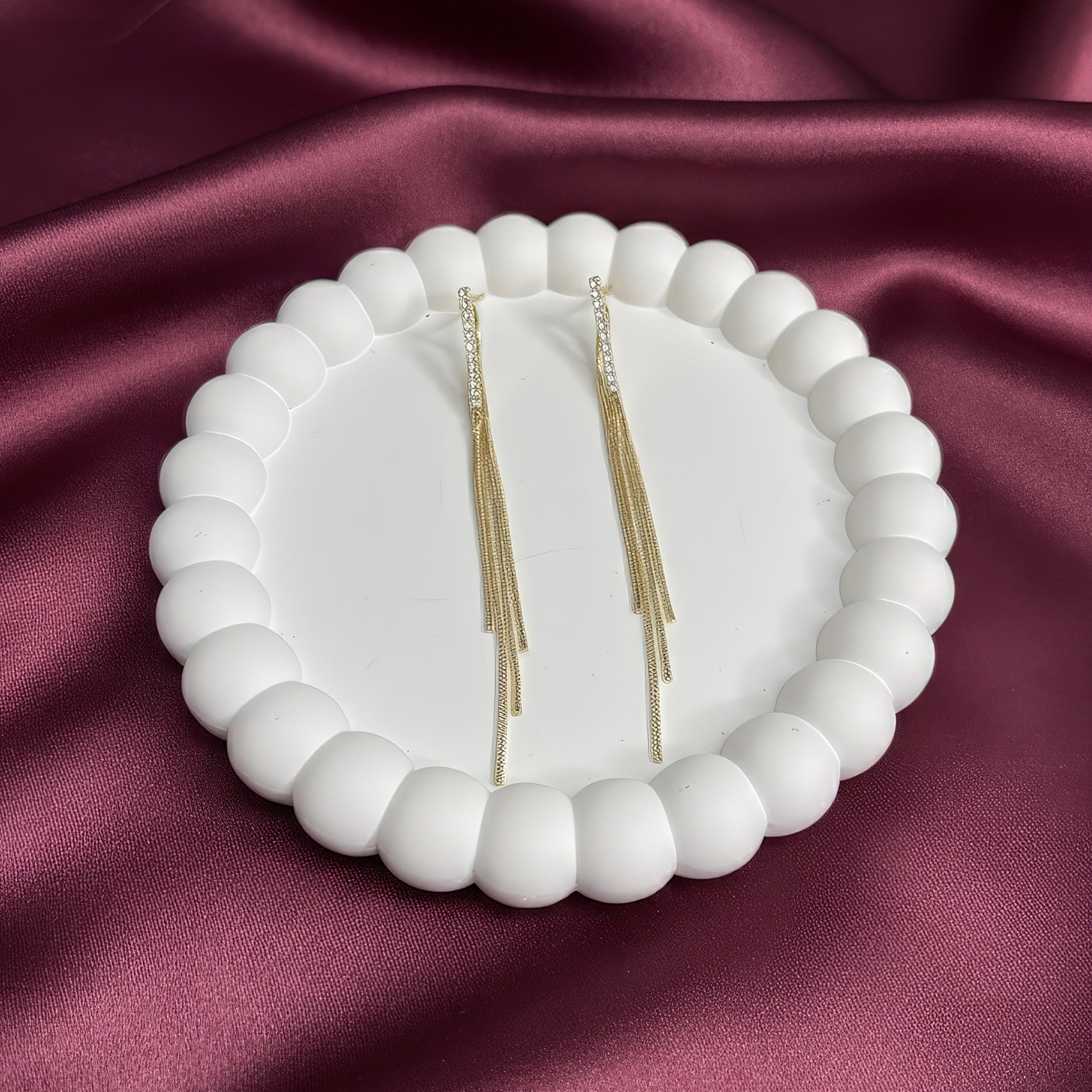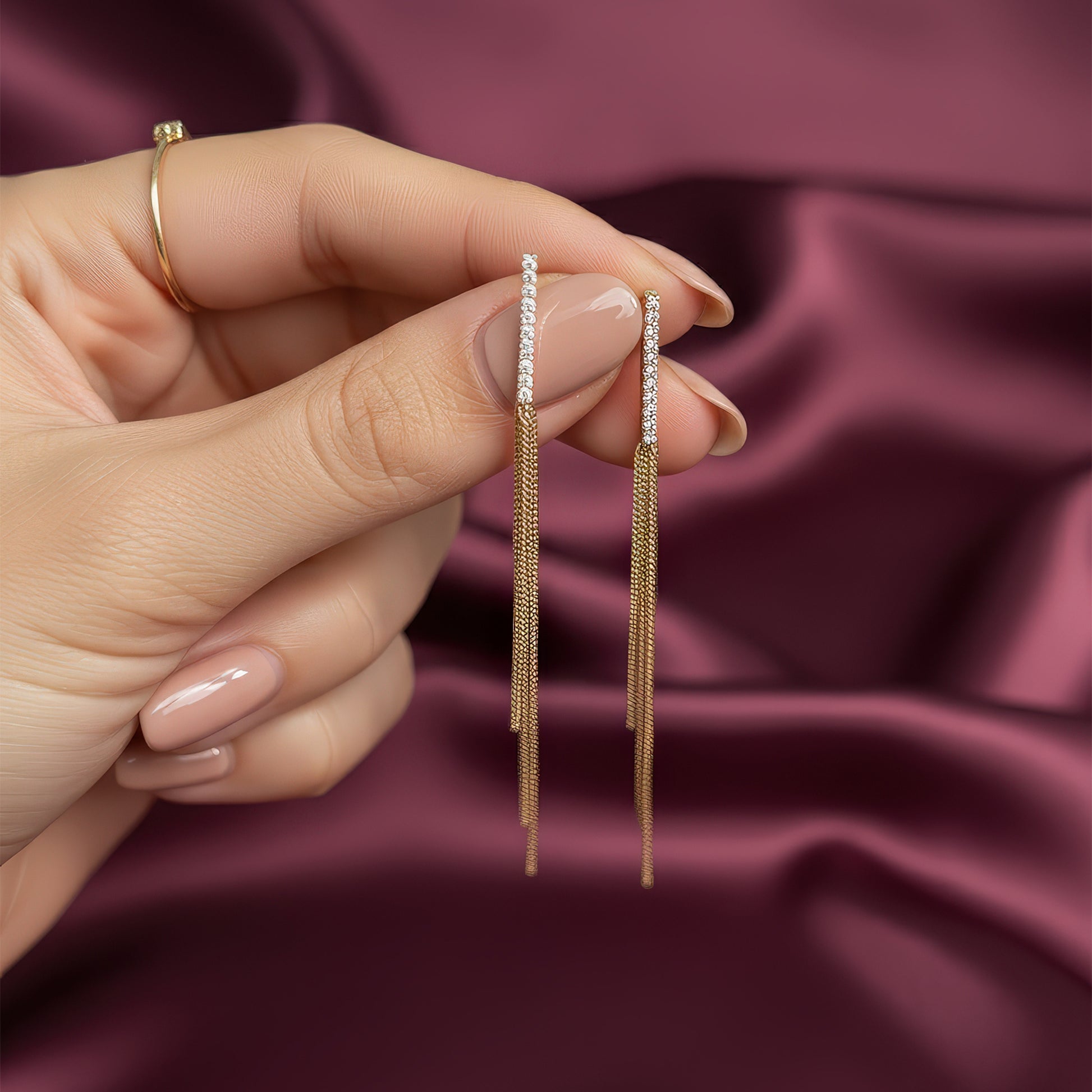 Prepare to dazzle with the Celestial Rain, earrings designed for breathtaking movement and radiant sparkle. These exquisite pieces begin with a slender bar, meticulously adorned with a line of brilliant pavé-set cubic zirconia, catching every ray of light with unmatched brilliance. From this sparkling foundation, a luxurious waterfall of delicate golden chains cascades downwards, creating a fluid, shimmering fringe that dances with your every turn. Perfect for making a sophisticated statement at galas, weddings, or any special occasion, these earrings are crafted to add unparalleled glamour and a touch of golden allure to your most cherished moments.