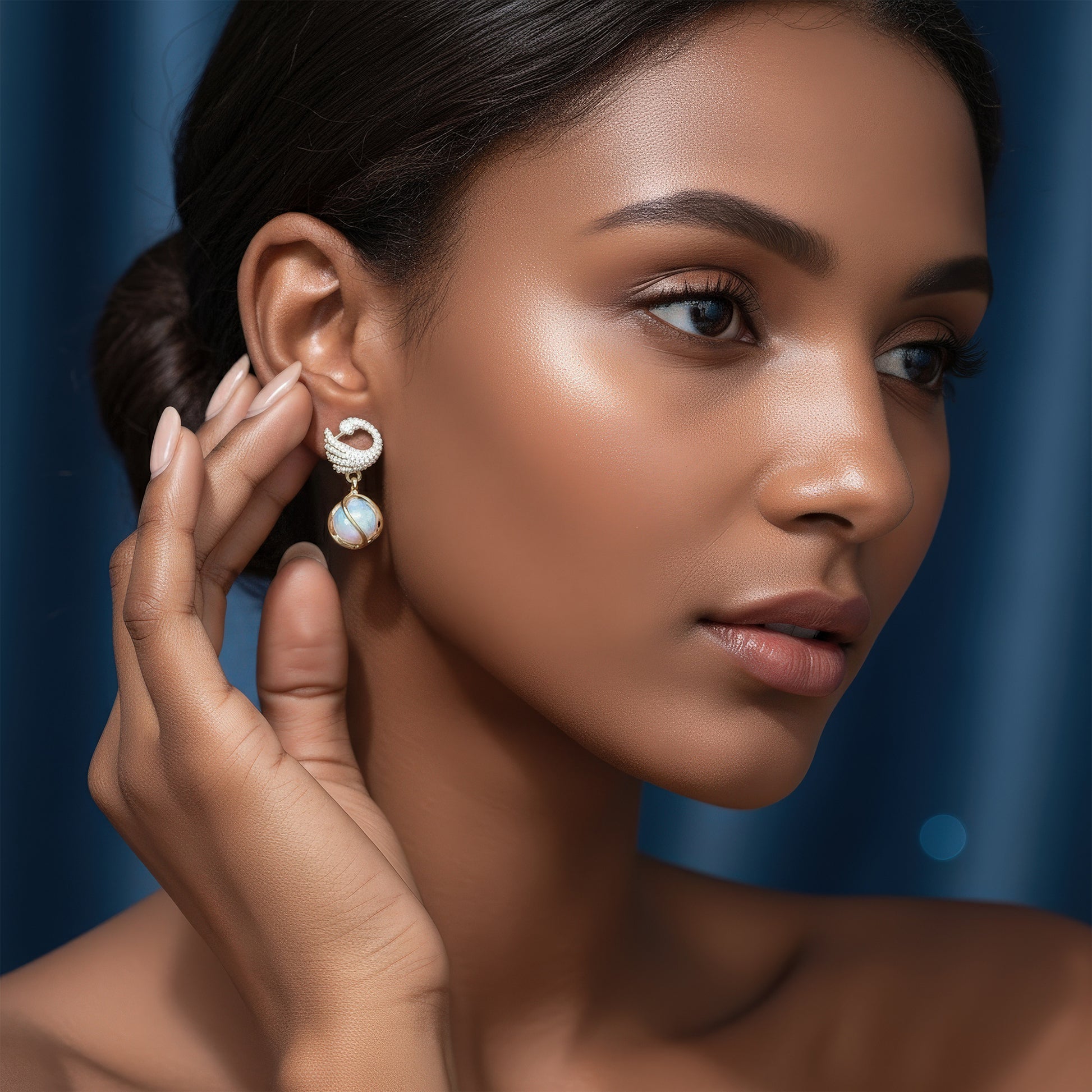 | Grace, movement, and light—these earrings are purely enchanting! Our Golden Swan Drops feature a beautifully sculpted swan neck and wings, completely covered in brilliant pavé-set crystals. From the swan, an abstract, polished golden bezel cradles a smooth luminous opal-effect stone, which catches the light with a soft, ethereal glow. Slip them on for instant elegance; they're the perfect accessory to add a touch of sparkling sophistication and unique beauty to any special occasion or date night. |