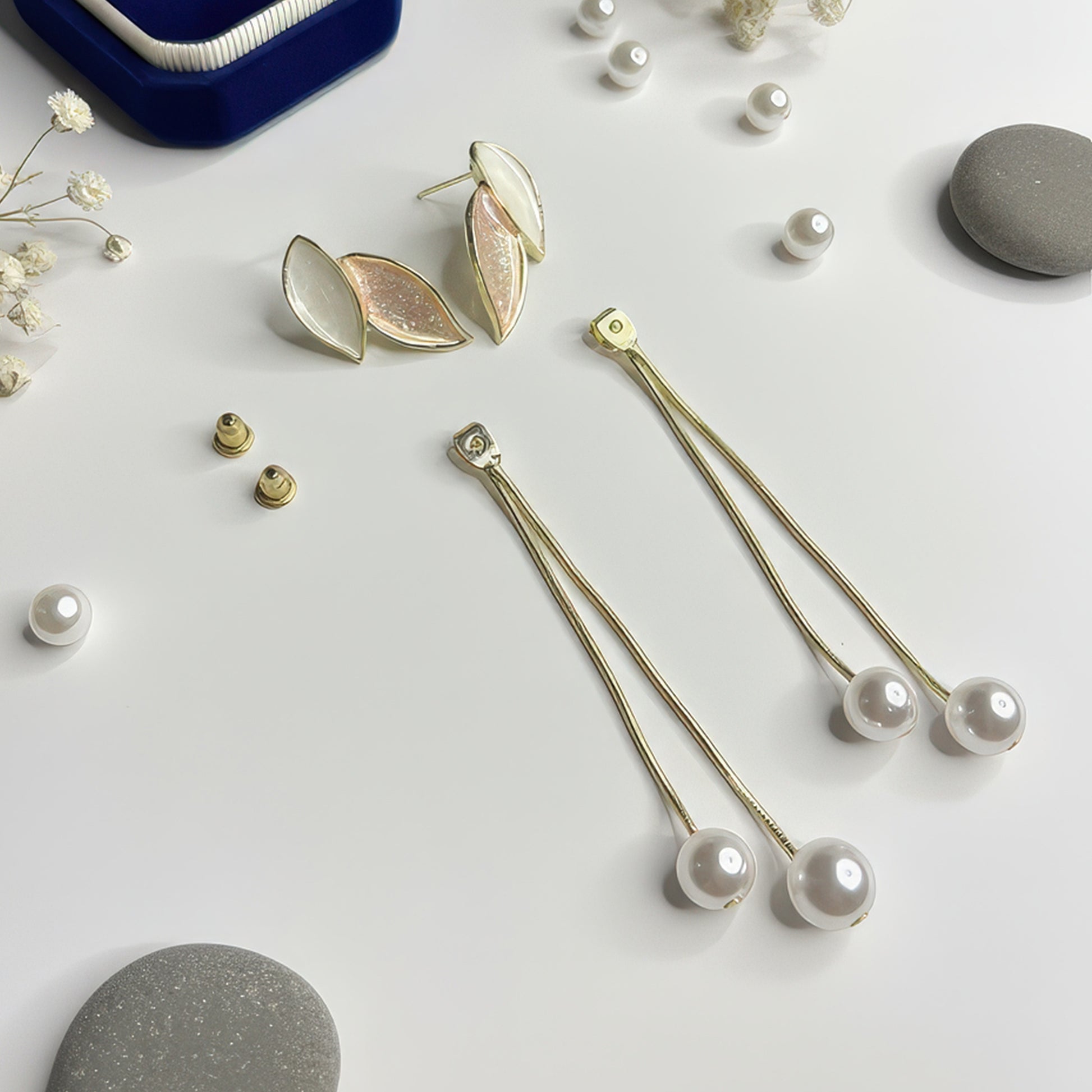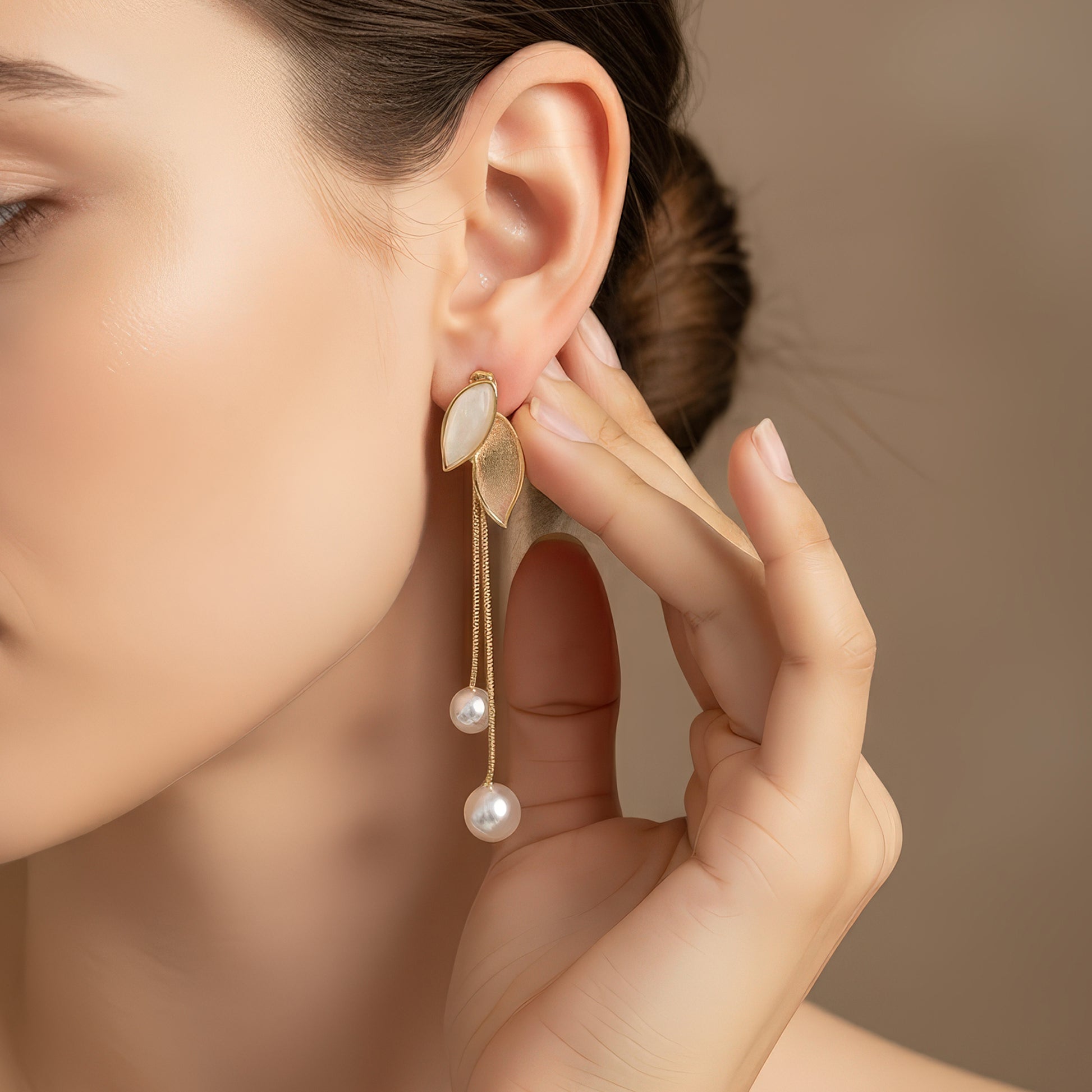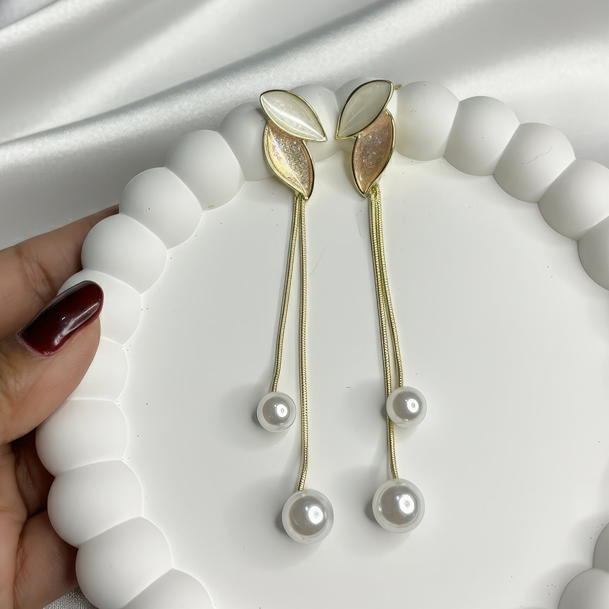 Golden Willow Drops with graceful movement and effortless elegance. These stunning earrings feature a delicate two-tone leaf stud, combining an iridescent white or cat's eye element with a soft, glittering blush or rose gold-toned enamel base, all framed in polished gold-tone metal. From the leaf motif, two slender golden snake chains cascade down, finishing with two perfectly sized faux pearls. The long, fluid design creates beautiful shimmer and swing, making them a captivating choice for weddings, date nights, or any time you want a dramatic yet refined accessory.