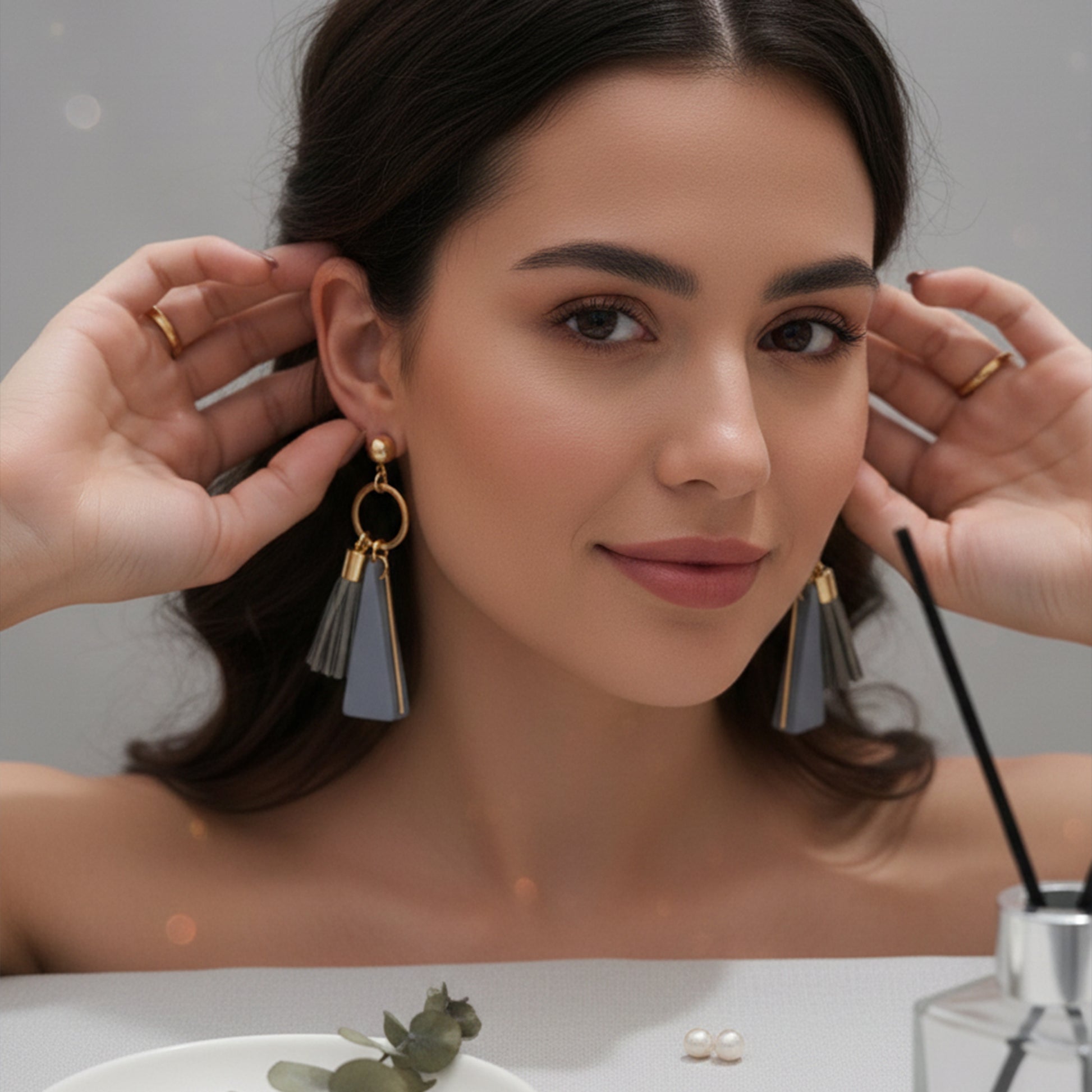 Embrace contemporary sophistication with our Urban Luxe Tassel Earrings, the perfect accessory to elevate your modern wardrobe. These striking earrings feature a polished gold-tone ball stud that leads to a sleek golden O-ring. From this elegant foundation, a playful yet refined trio dangles: a lush black mini-tassel, a smooth black geometric pendant, and a minimalist gold-tone bar. The captivating contrast of matte black and shimmering gold, combined with varied textures and shapes, creates an effortlessly chic and versatile statement. Ideal for adding a touch of edgy elegance to your office attire, a night out, or simply when you want to feel incredibly stylish.